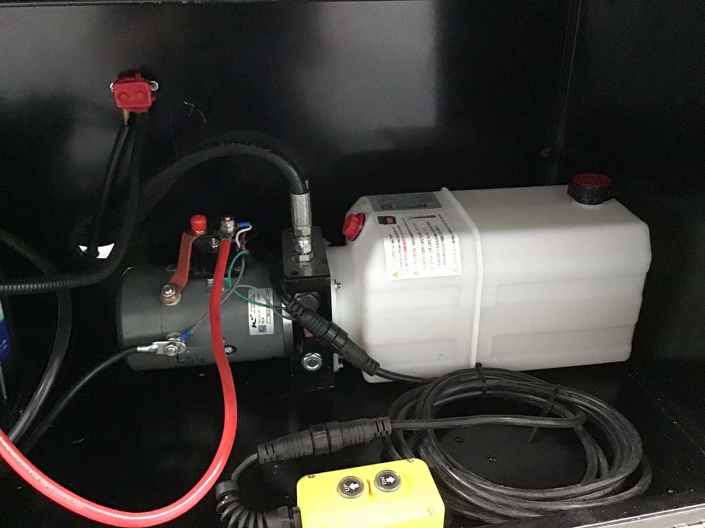 Side body locking tool box houses pump and battery